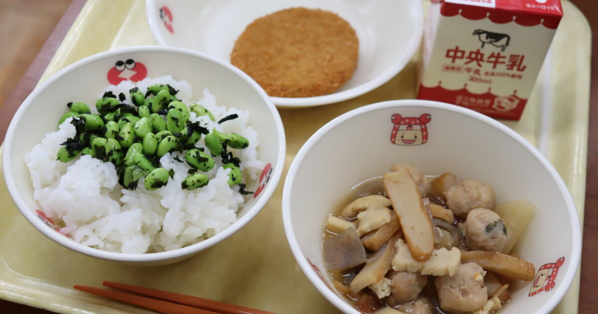 【献立】牛乳、ご飯、枝豆ご飯の具、コロッケ、関東煮 〈枝豆〉 今日の給食は、中学校3年生からリクエストがあった「枝豆ご飯の具」です。 枝豆は、大豆を若いうちに収穫したものです。枝付きのまま売られたり、ゆでたりしたことから […]