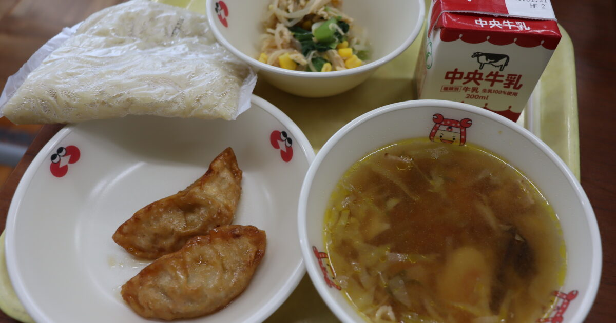【献立】牛乳、中華麺、ラーメンの汁、揚げ餃子の甘酢あんかけ、野菜の中華和え 〈ラーメン〉 今日の給食は、中学校3年生からリクエストがあった「ラーメン」です。 給食のラーメンは、にんじん、キャベツ、たけのこ、ねぎといった野 […]