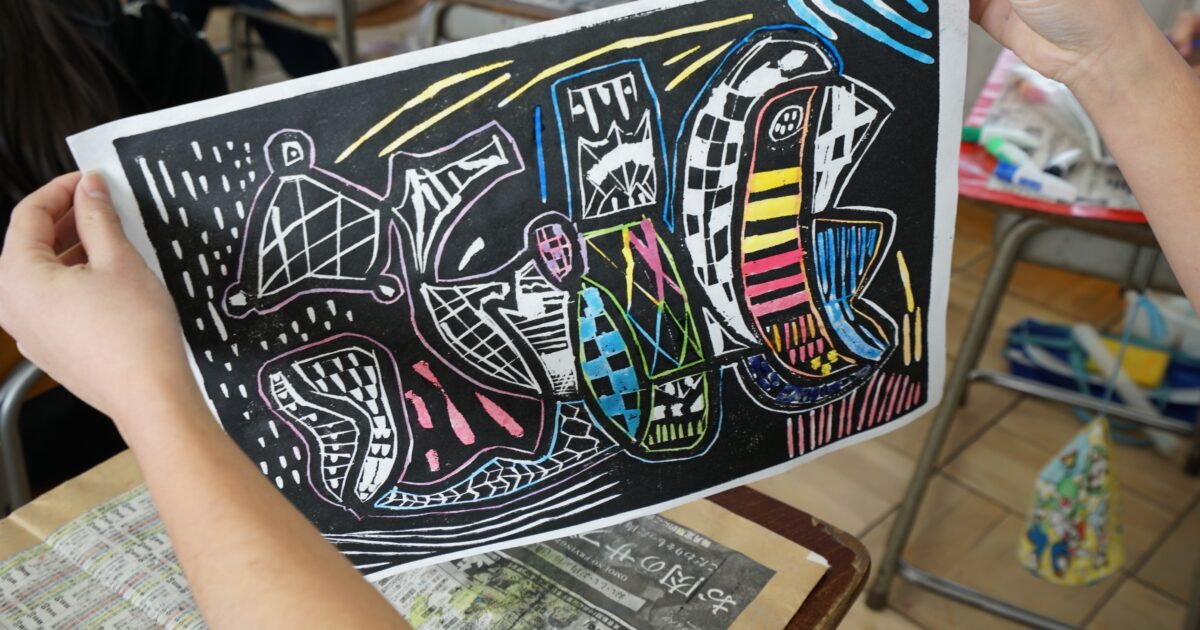 「ほってすって見つけて」もいよいよ大詰め。 刷り取った版画の裏に多めの水で溶いた水彩絵の具を塗っていきます。