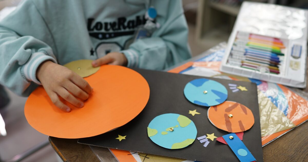 割りピンと厚紙で動く作品を作ります。 割りピンを使ってできる動きをいろいろ試したり、友だちと交流したりしてそれぞれの思いやアイデアを形にしていきます。