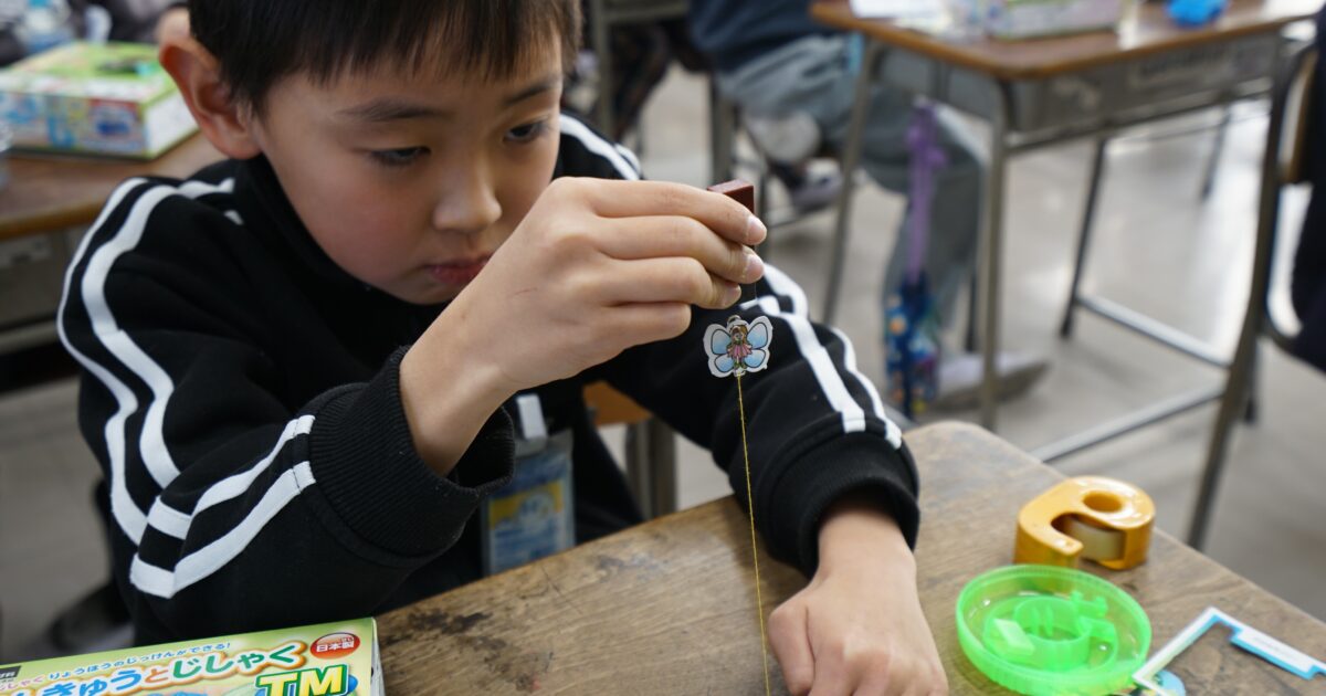 重ねて留めた色画用紙の動きを生かしたり、留めたところを軸に回転させたりする簡単な仕組みを使ったりして動きのある作品づくりに取り組んできた3年生。 動きの感じに合う形や色を考えたり、試したりしながらイメージをふくらませ思い […]