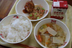 【献立】牛乳、ご飯、ヤンニョムチキン、春雨サラダ、ワンタンスープ