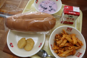 【献立】牛乳、サンドイッチロール、チキンナゲット、ナポリタン、ベリーヨーグルト