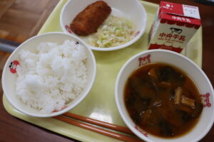 今日の給食は、人気メニューの一つ「いかフライのレモンソースかけ」です。