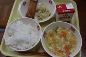 【献立】牛乳、ご飯、愛知の野菜春巻き、白菜とチンゲンサイの中華サラダ、コーンたまごスープ