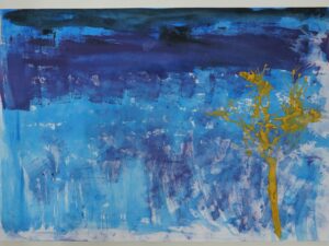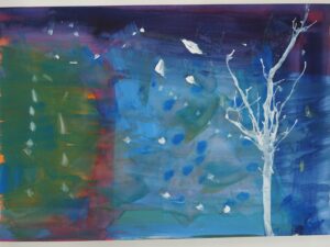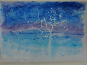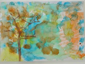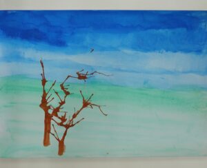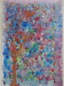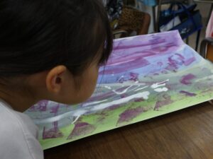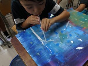 3年生 10月7日(火) 3年生 図画工作「色とり鳥」 2025.10.09 by shinkanie001 スポイトで絵の具をたらし、ストローで吹いて枝らしく・・・。 吹き流し(たらした水分の多い絵の具を、ストローなどで息を吹きかけて散らし、模様やデザインを作り出す技法)で前回仕上げた「背景」に木を描きました。