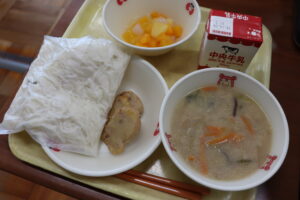 【献立】牛乳、ソフト麺、豆乳ちゃんぽんの汁、たこナゲット、みかんゼリーポンチ