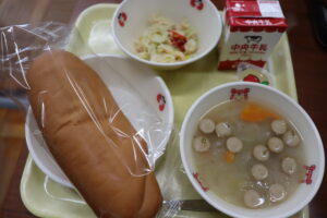【献立】牛乳、ロールパン、チキンサラダ、きのことニョッキのスープ、一口ゼリー