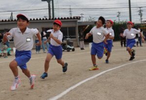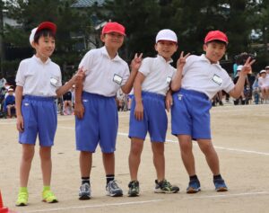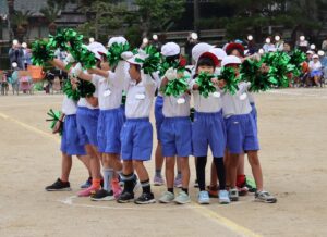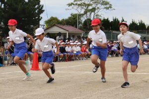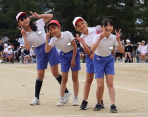 4年生の走る競技「80m一本勝負!走った後はハイ・ポーズ!」は、80mを全力で走りました。走っているときはライバルだったけれど、走った後は一緒に仲良くポーズを決めました!