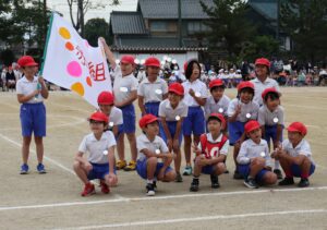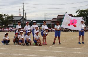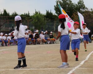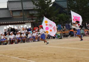 3年生の走る競技「つなげ、応援旗!絆のバトンリレー」。バトンの代わりは、なんと手作りの応援旗!上手につないで、力いっぱい走りました!