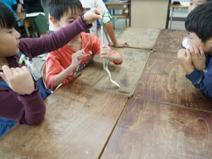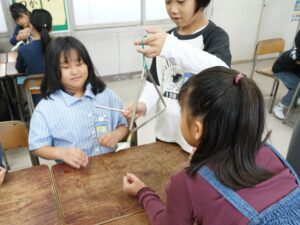 この日の天気は曇り…、残念ながら「かげ」の観察ができません。そこで「音のせいしつ」の学習をすることに・・・。「音のせいしつ」は目に見えない“音”について学ぶ単元です。