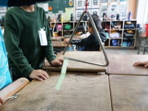 今日は、トライアングルに付箋を貼り、音が出ているトライアングルを握ったときの付箋の様子や、トライアングルをたたく強さを変えたときの付箋の様子を観察しました。