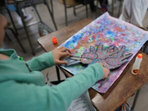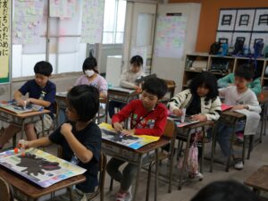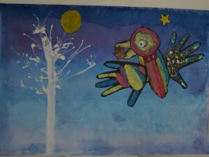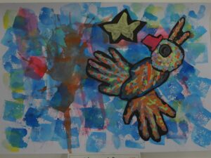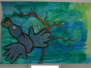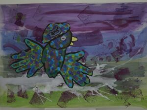 スポンジでたたくように色をつけたり、刷毛のように色をのばしたりして描いた「空」に、多めの水で溶いた絵の具をたらし、ストローで息を吹きかけて「木」を描き、頭・胴体・羽の各パーツを組み合わせて作った「鳥」を貼り付けて・・・、少しずつ描き進めてきた「色とり鳥」が完成しました。