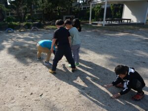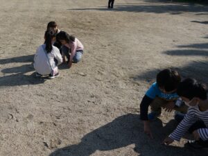 日なたの地面と日かげの地面に手を当てて、見た目やあたたかさ、しめりぐあいをそれぞれ調べてみると、日なたの地面は明るい、あたたかい、乾いている。日かげの地面は、暗い、つめたい、しめっているなどの違いがありました。