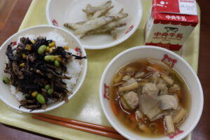 【献立】牛乳、ご飯、ひじきご飯の具、わかさぎのからあげ、ちゃんこ汁