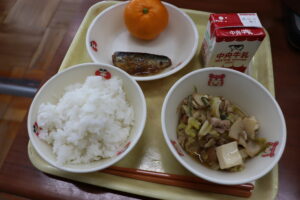 【献立】牛乳、ご飯、いわしの梅煮、すきやき風煮、みかん