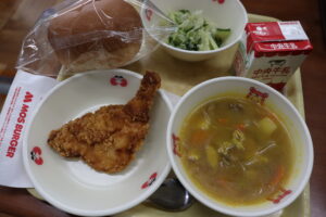 【献立】牛乳、サンドイッチバンズ、モスチキン、フレンチサラダ、カレースープ