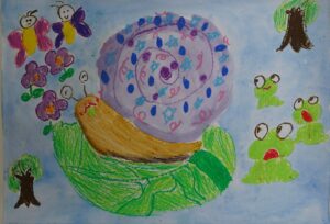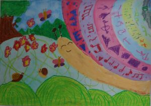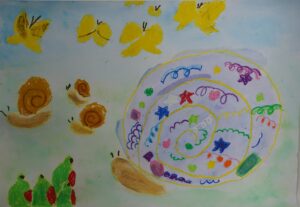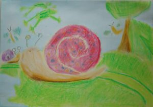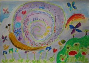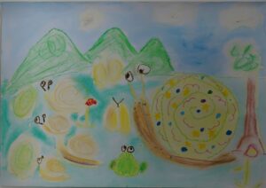「せかいいちおおきなうち」を欲しがる小さなかたつむり。一生懸命がんばって、世界一大きくて美しい家を手に入れるのですが・・・。レオ=レオニさんの絵本「せかいいちおおきなうち」の世界観をぼかしやにじみ、はじき絵などを使って表し方を工夫して表現しました。