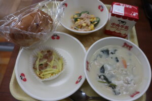 【献立】牛乳、りんごパン、じゃがいものベーコン焼き、冬野菜の豆乳シチュー、ツナと野菜のサラダ