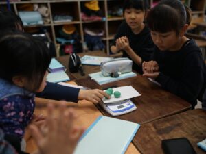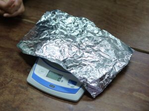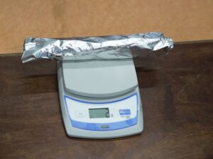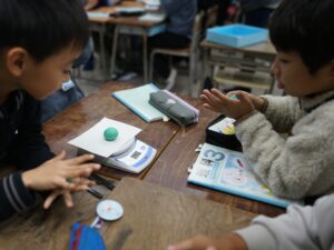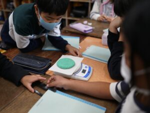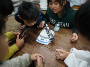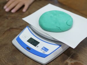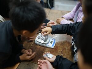 手で持って比べてみてもはっきりしないので、「電子てんびん」を使って、200gの粘土をまるめたとき、平らにしたとき、細かく分けたとき。2gのアルミニウムはくを細長くしたとき、細かく分けたとき、まるめたとき。それぞれの重さをはかって比べます。