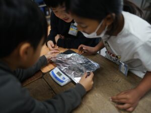 粘土やアルミニウムはくの形をかえて、重さがかわるか調べてみることに・・・。。