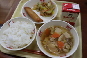 【献立】牛乳、ご飯、春巻き、白菜とチンゲンサイの中華サラダ、ワンタンスープ