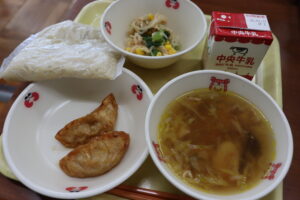 【献立】牛乳、中華麺、ラーメンの汁、揚げ餃子の甘酢あんかけ、野菜の中華和え