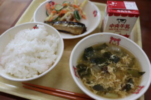 【献立】牛乳、ご飯、いわしのしょうが煮、マカロニサラダ、かきたま汁