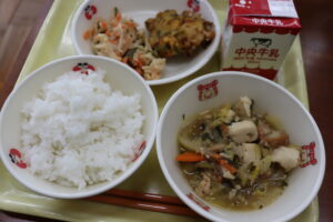 【献立】牛乳、ご飯、かきあげ、ひきずり、切り干し大根の練りごま和え