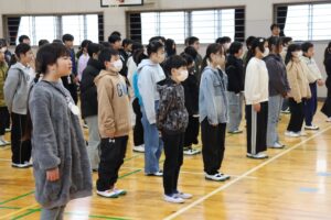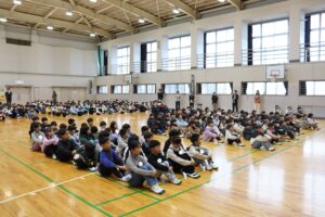 3学期始業式。全校児童が体育館に集まって行いました。