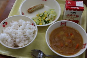 【献立】牛乳、麦ご飯、米粉のカレー、白ウインナー、キャベツとコーンのサラダ