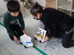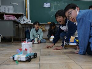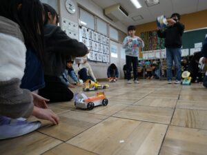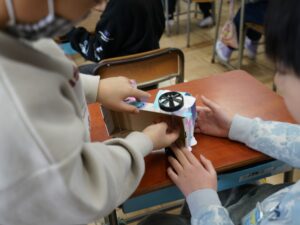 4年生 1月30日(金) 4年生 図画工作「ゴムでゴー!ゴー!ゆめの乗り物」 2026.02.02 by shinkanie001 後ろの車軸にゴムを取り付け、完成した作品を走らせました。 「ゆめの乗り物」を夢中で走らす子どもたち、思いを込めて作った作品だけに、うまく走った時の喜びはひとしおだったようです。