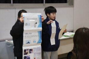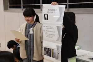 総合的な学習の時間や出前授業、校外学習などで学んだことから普段の生活に目を向け、今の自分たちにできることは何かを発表しました。