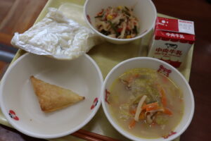 【献立】牛乳、中華麺、とんこつラーメンの汁、茎わかめと切り干し大根のサラダ、手作りアップルパイ