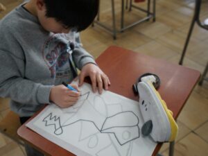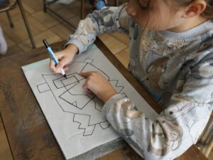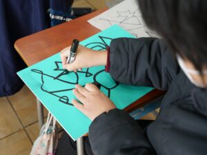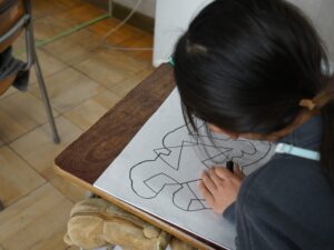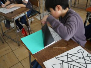 4年生 2月5日(木) 4年生 図画工作「ほってすって見つけて」 2026.02.09 by shinkanie001 「ほってすって見つけて」の授業が始まりました。思いのままに描いた線の中に彫刻刀を使い分けながら模様を彫り込んでいきます。今日は、カーボン紙とトレーシングペーパーを使って下絵を版木に写し取りました。