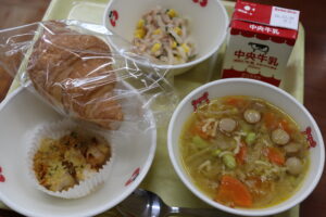 【献立】牛乳、クロワッサン、タラのパン粉焼き、大根サラダ、アルファベットスープ