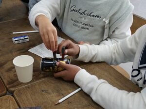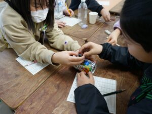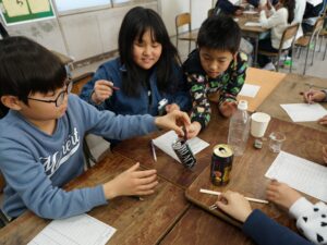今回は、どんな物が電気を通すかを調べる際に使用したペットボトル、スチール缶、アルミ缶、ガラスのコップ、わりばしなどに磁石を近づけて、磁石につくかどうか調べます。
