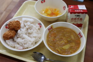 【献立】牛乳、麦ご飯、米粉のカレー、舌平目のフライ、彩りフルーツポンチ
