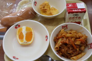 【献立】牛乳、小型ロールパン、ペンネのミートソース、手作りオムレツ、清見オレンジ
