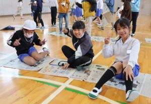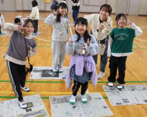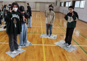 新聞紙に乗って、ジャンケン!負けたら新聞を折りたたみます。長く新聞に乗っていられたら勝ちというゲームです。