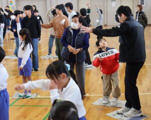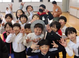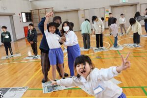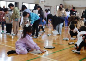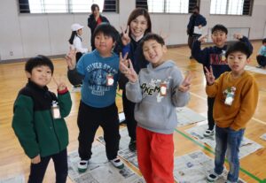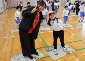 低学年の子も高学年の子も、みんなしんぶんマンとのジャンケンに必死です!