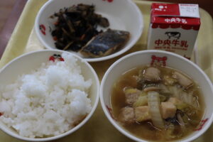 【献立】牛乳、ご飯、さわらの香味焼き、ひじきの炒め煮、ちゃんこ汁