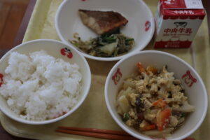 【献立】牛乳、ご飯、めばるの煮つけ、おやこ煮、ほうれん草のいそか和え