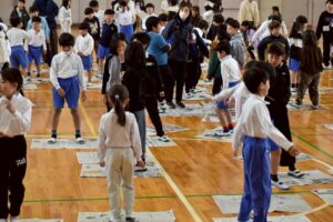 2月20日の2放課に、今回も新聞紙を使った遊びを開催しました。広げた新聞紙を陣地にして、ジャンケンで負けるかあいこだったら折りたたんでいきます。立っていられないほど新聞紙が小さくなったら負けです。