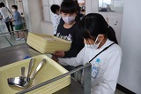 【給食センターより】麵の食べ方・・・今年度初めての麺です。給食の麺を,汁やソースに全て入れてしまって,あふれてしまった!という経験はありませんか? 今日は給食の麺を上手に食べるコツを紹介したいと思います。麺の袋の裏側に縦にひらひらがついているのがわかるでしょうか? まず,ひらひらに合わせて麺を半分に切ります。次にひらひらが縦になるようにして袋を持ち,左右に引っ張ると真ん中で袋が半分に切れます。切れたところから麺を半分ずつ汁に入れて食べましょう。袋は細く折りたたんで,クルっと結ぶとゴミが小さくなり片付けも簡単になりますよ。ぜひやってみてください。
